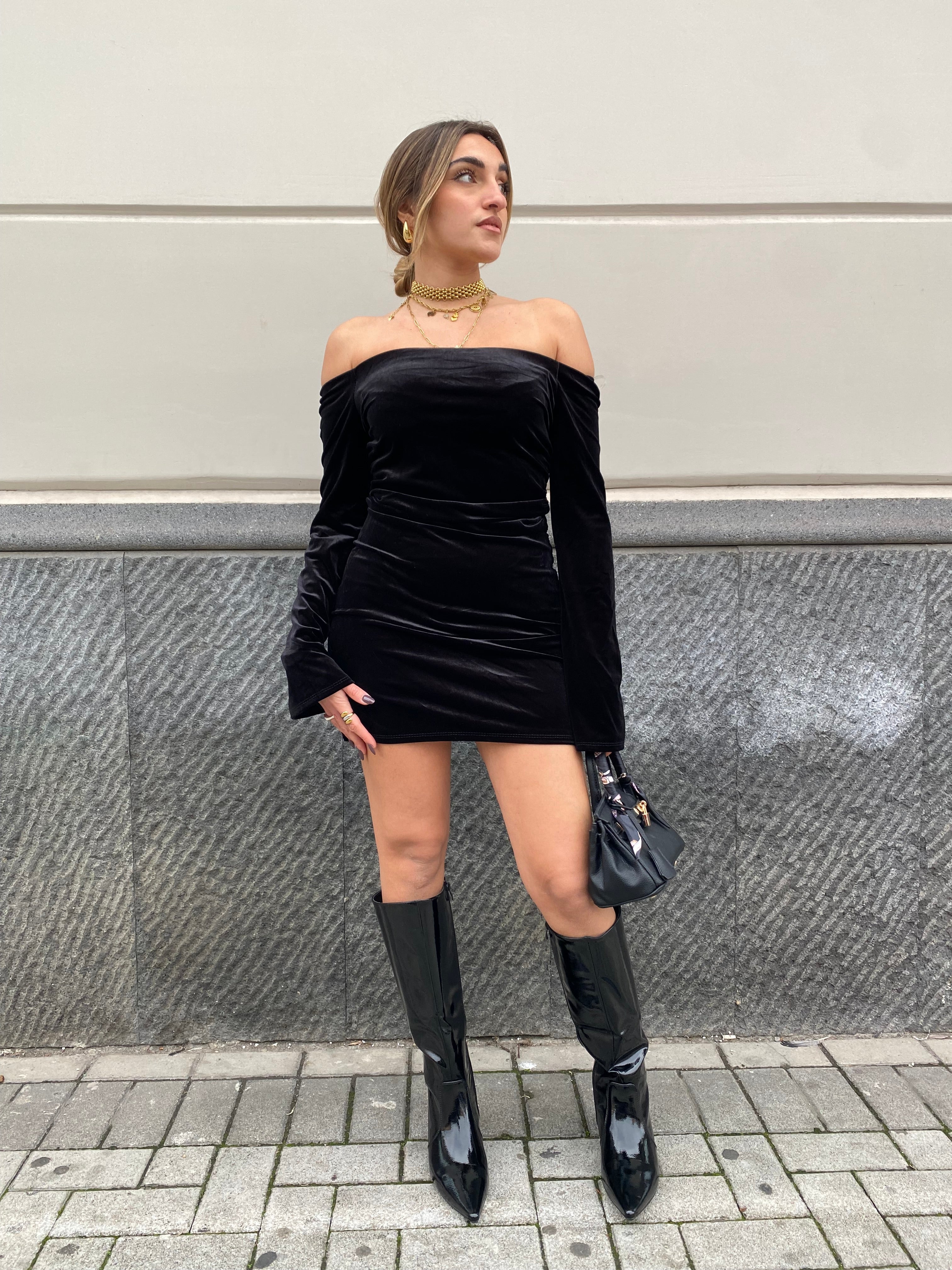 Abito corto, in ciniglia, scollo a barca, elasticizzato, manica lunga, vestibilità aderente, taglia unica adattabile ad XS,...