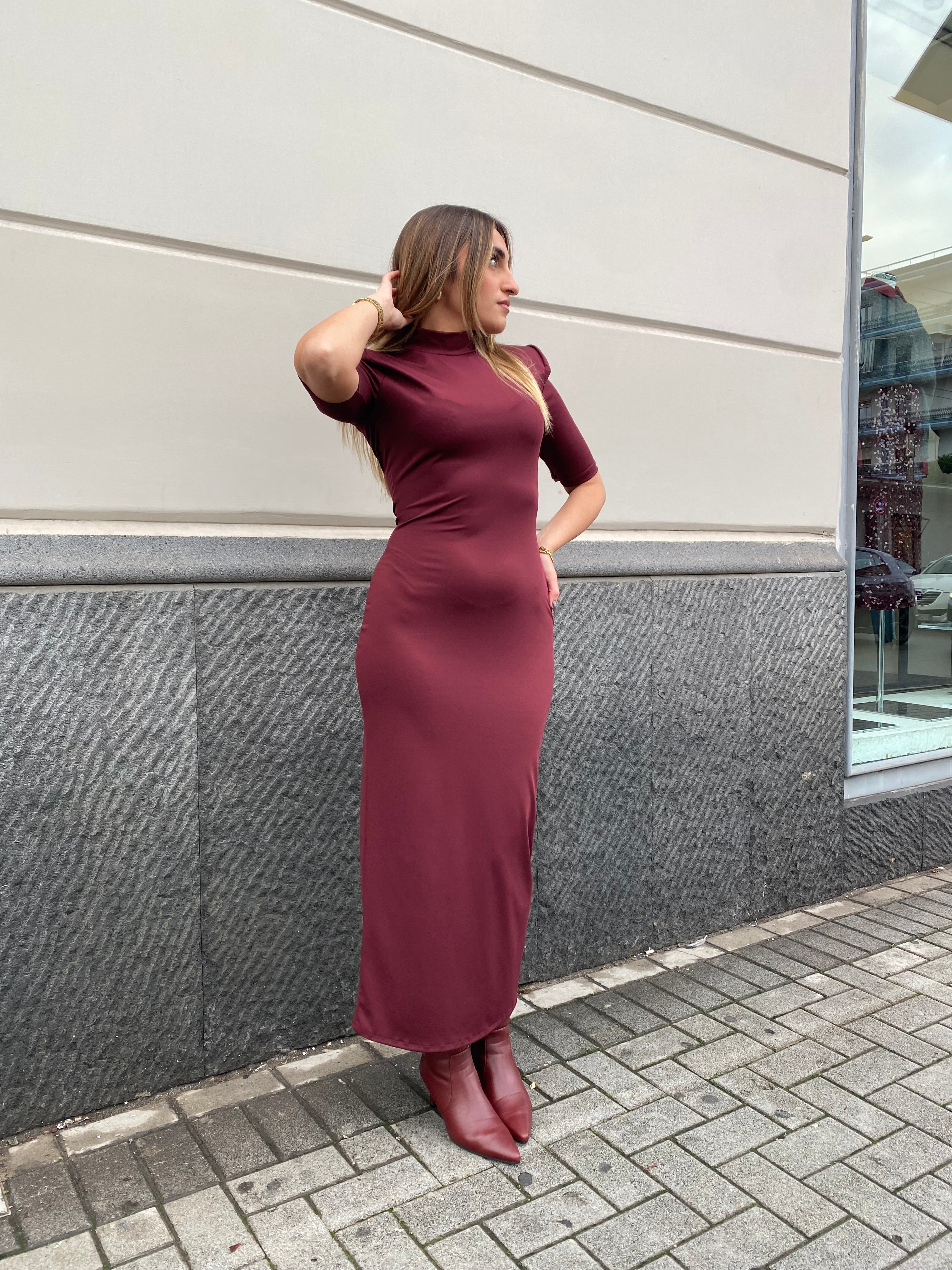 Abito lungo sotto al ginocchio, elasticizzato, vestibilità aderente, con spalline imbottite e mezzo collo, taglia unica adattabile...