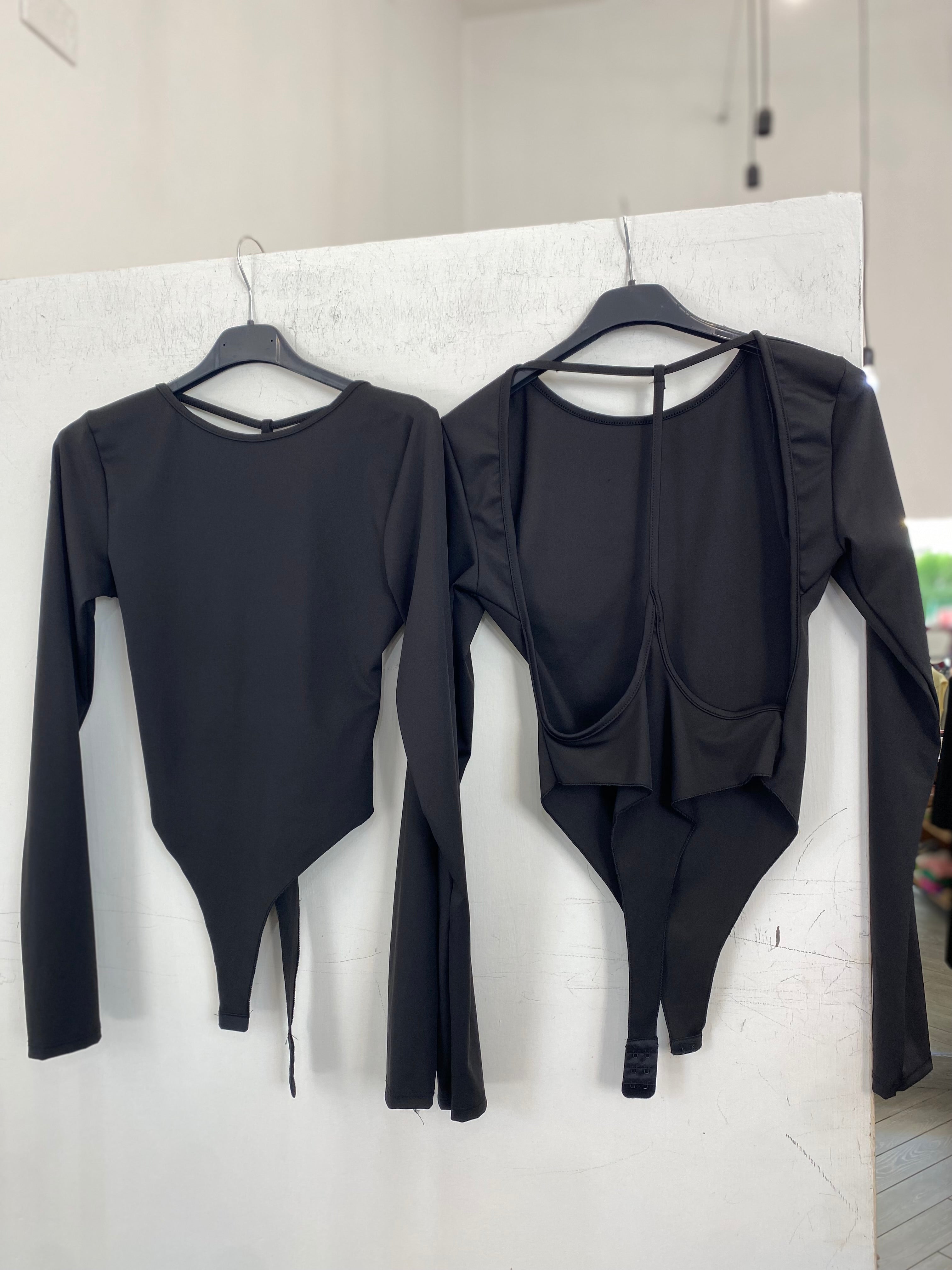 Body elasticizzato, completamente scollato dietro, taglia unica adattabile ad xs, s, m.