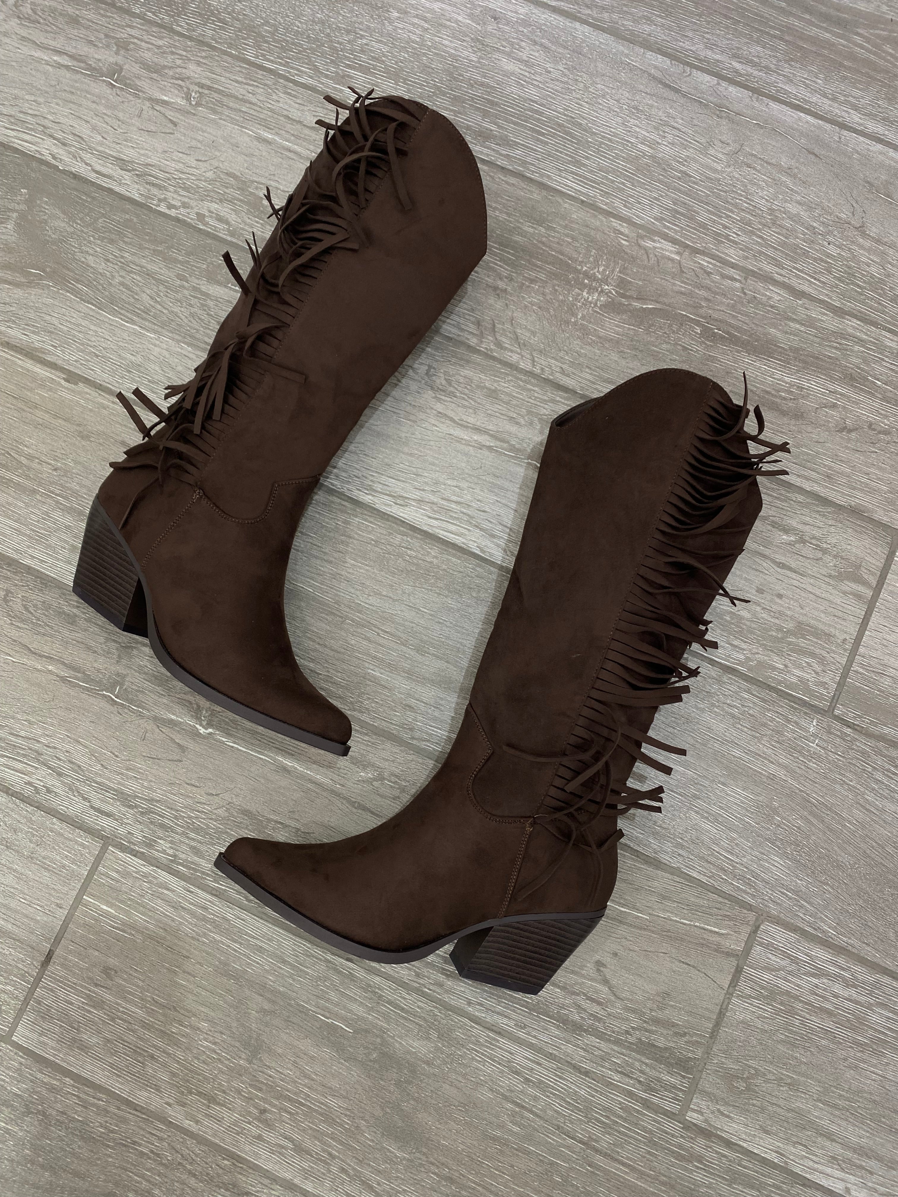 Camperos in eco camoscio con frange laterali. Gambale 42 cm, tacco 6 cm.