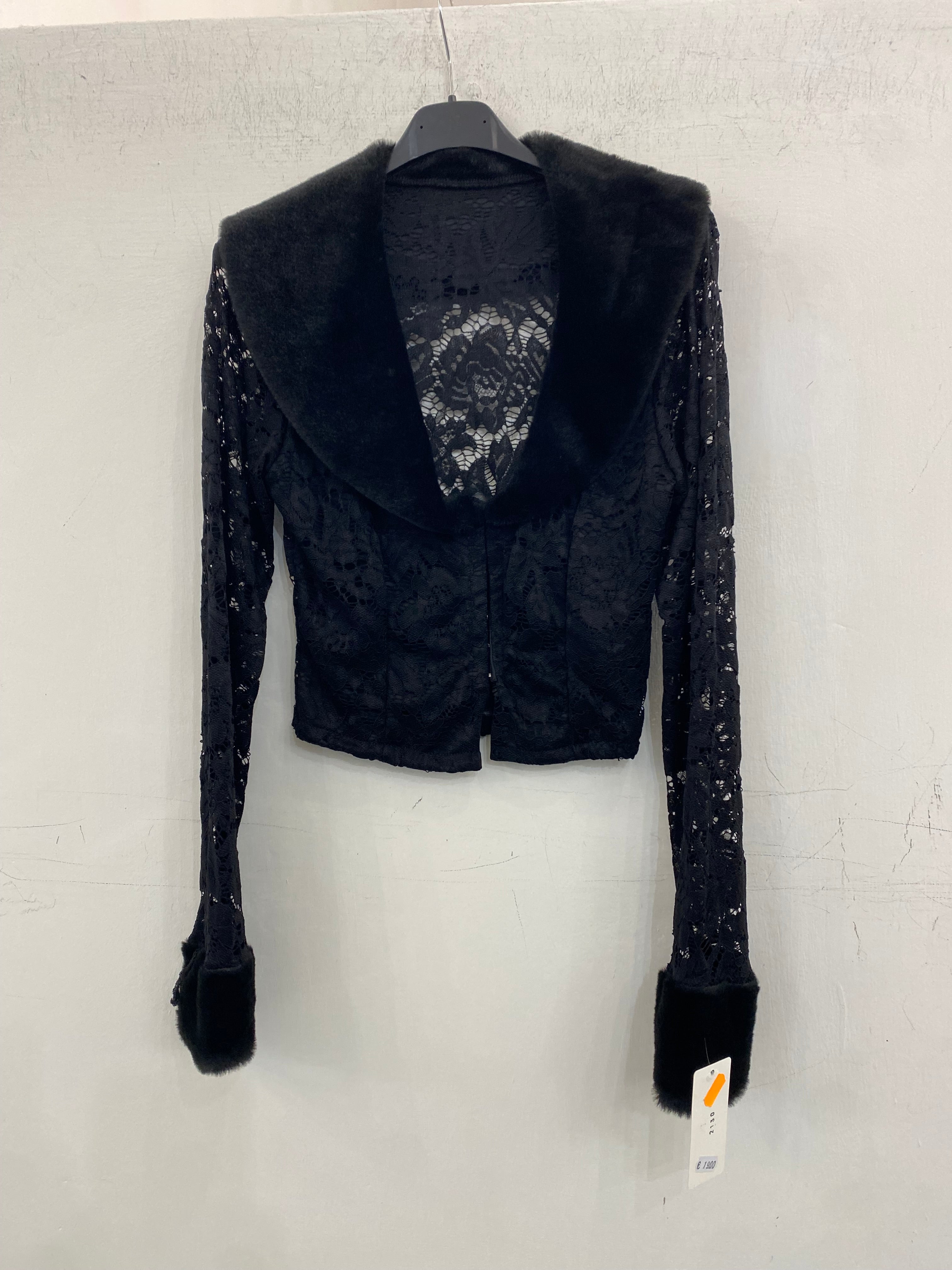 Cardigan traforato in pizzo, con dettagli in ecopelliccia, taglia unica adattabile ad xs, s, m.