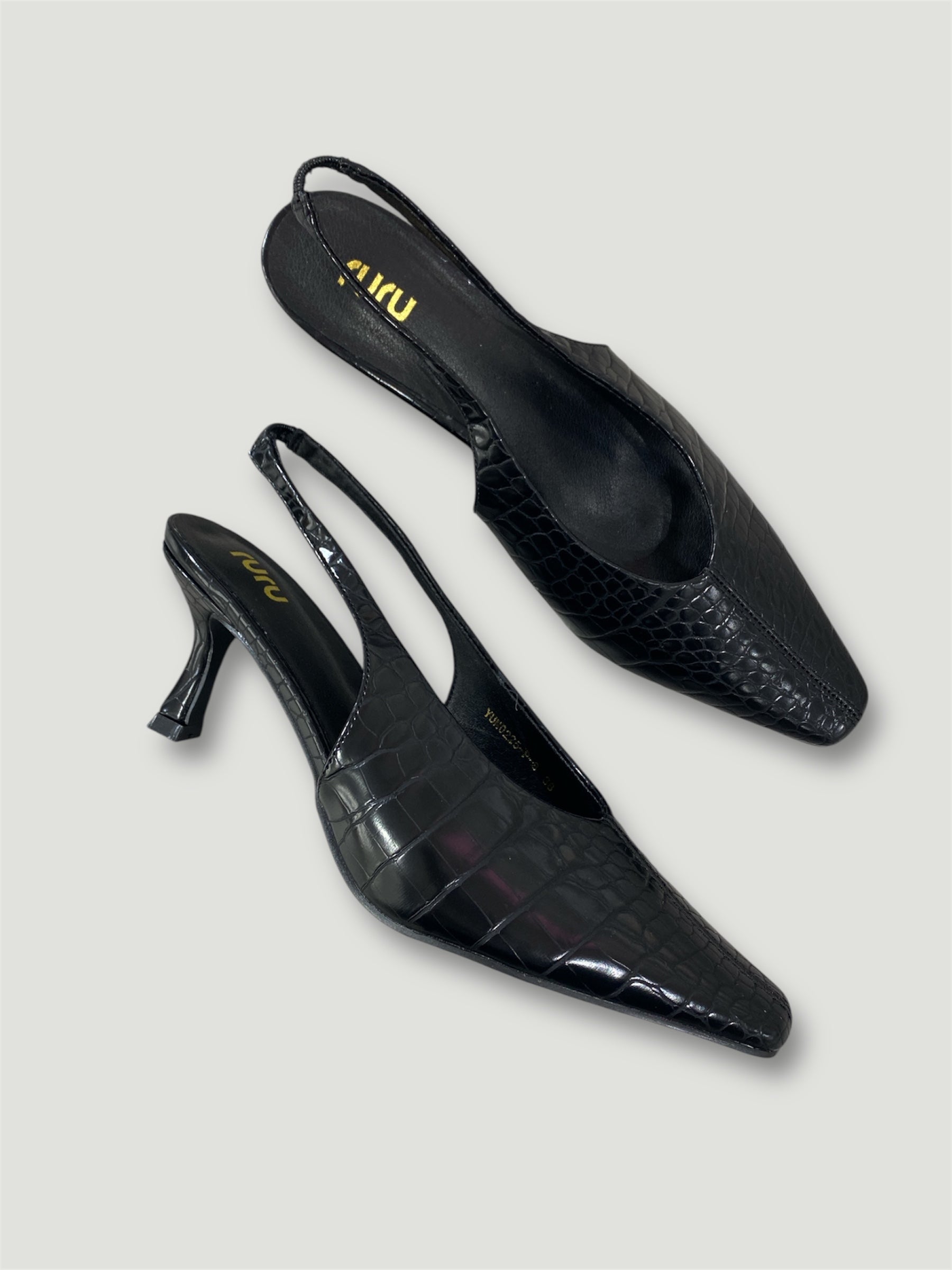 Decollete basso in ecopelle di coccordillo, punta squadrata, tacco da 6 cm.