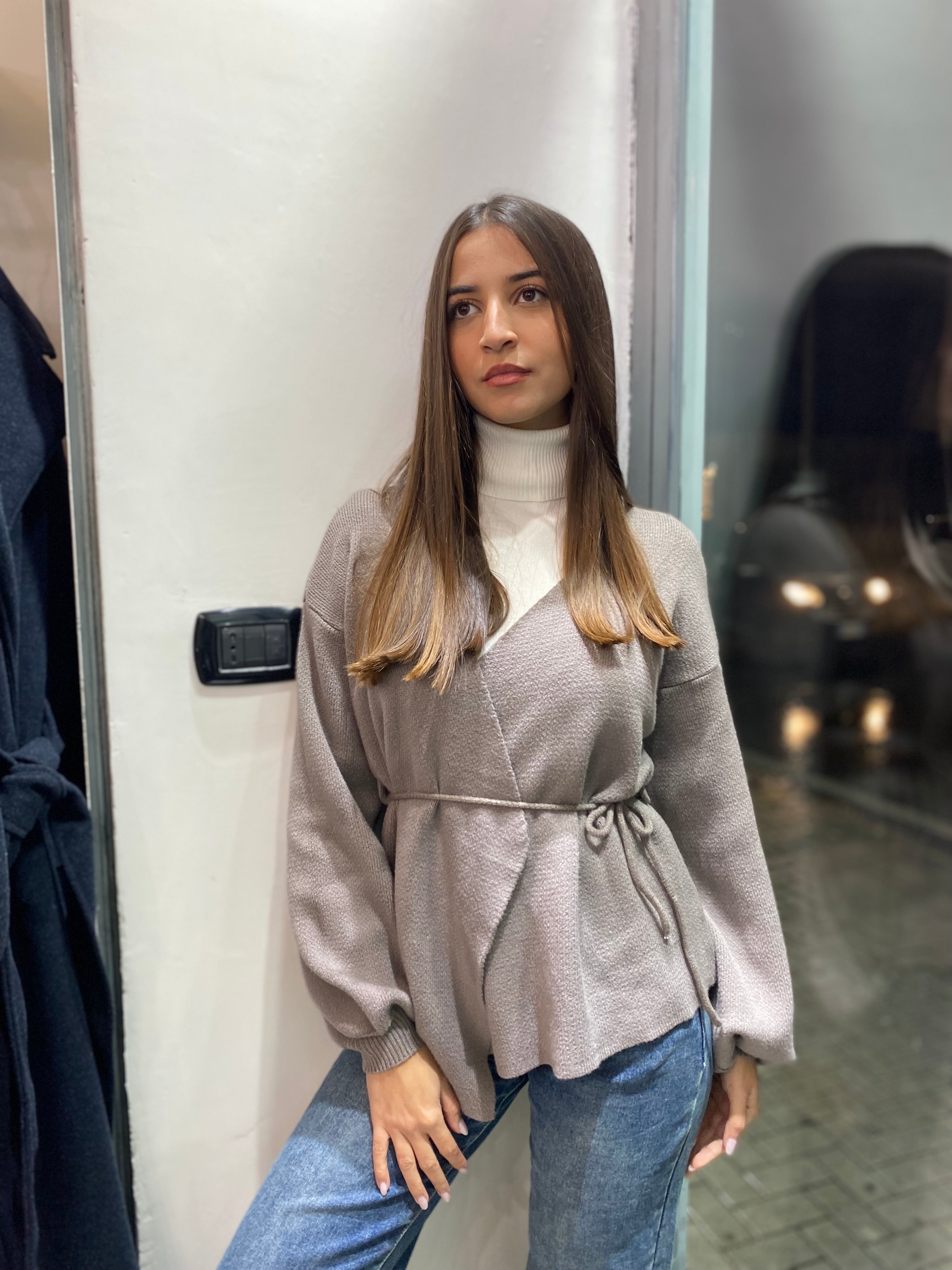 Maglioncino ad incrocio, con coulisse regolabile, elasticizzata, manica a sbuffo, taglia unica adattabile ad XS, S, M.