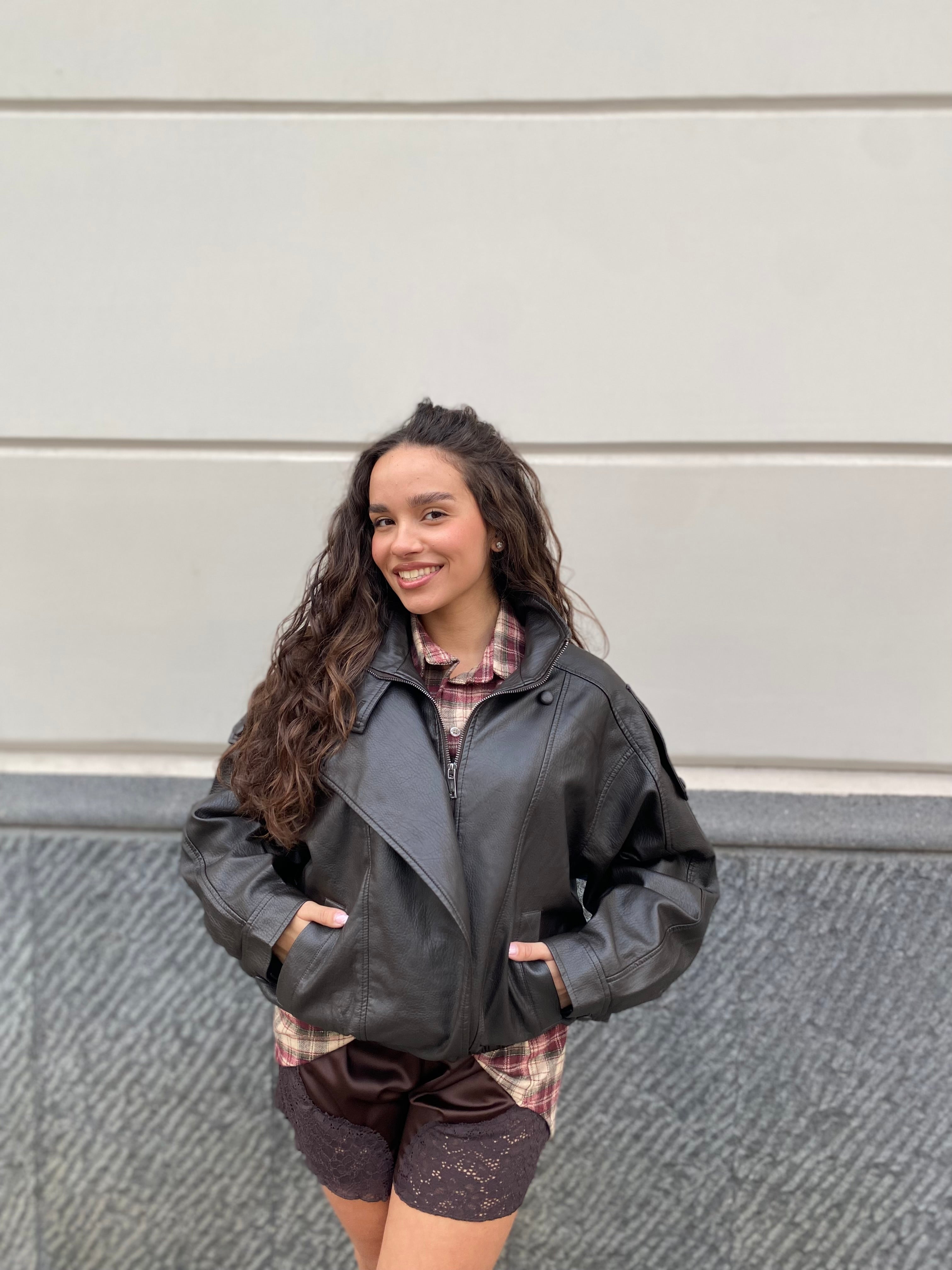Giubbotto in ecopelle, modello chiodo, con chiusura diagonale, zip e pattina, foderato internamente, vestibilità oversize.