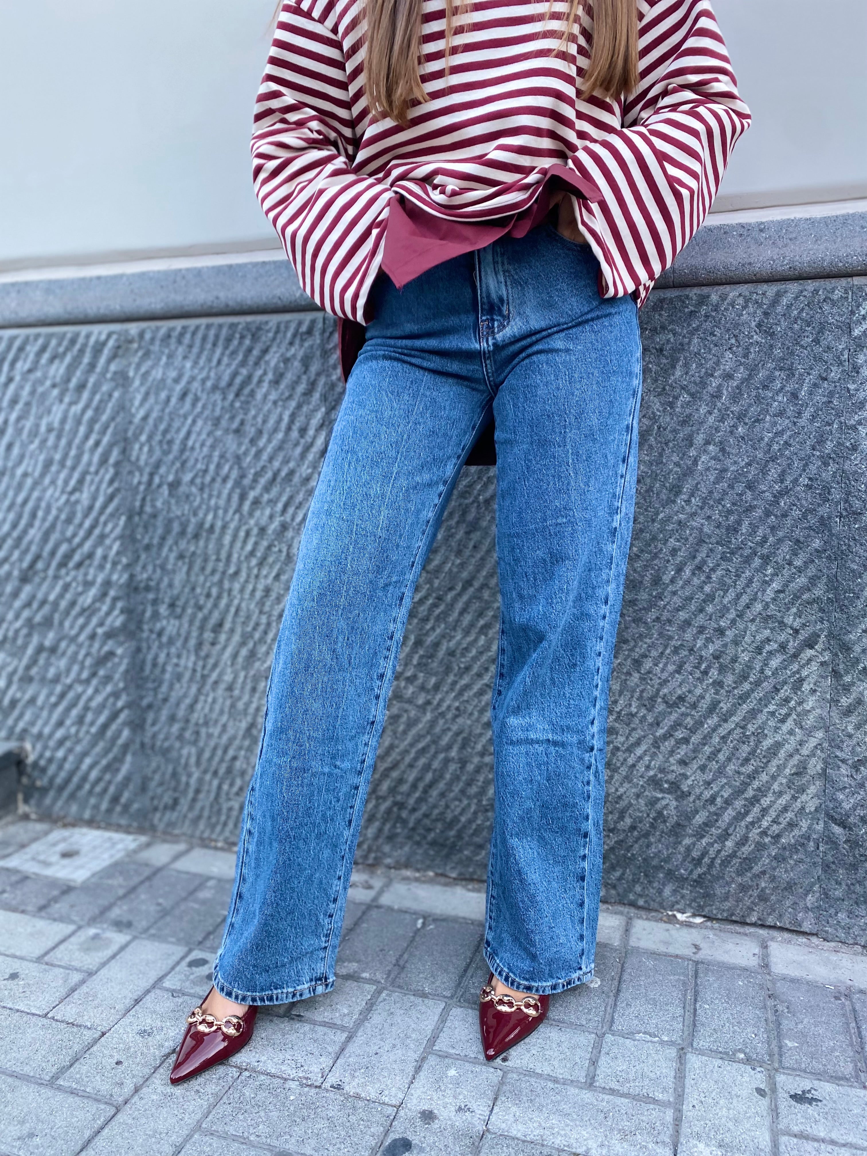 Jeans modello a palazzo, largo di gamba, non elastico.