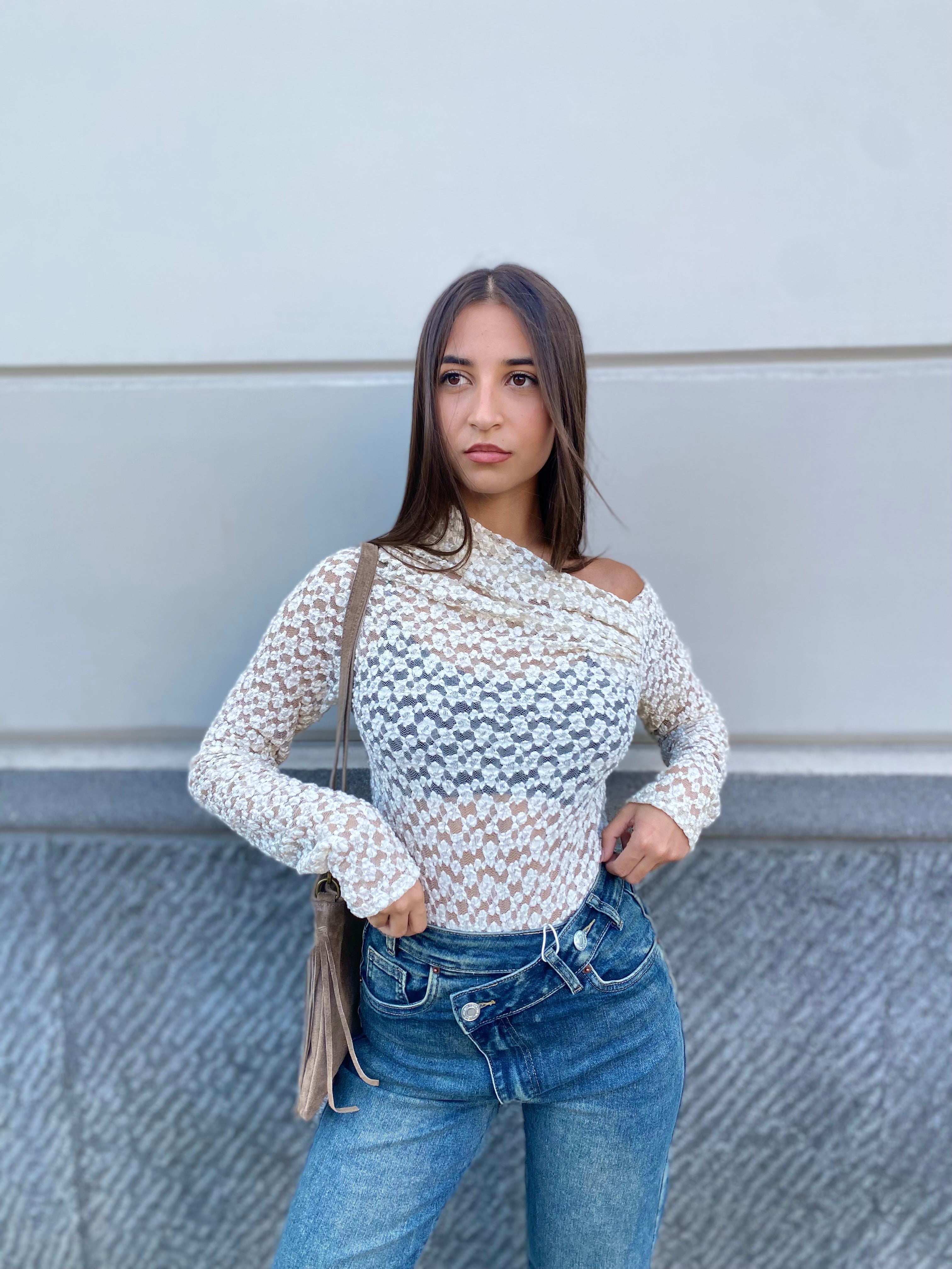Maglia elasticizzata, in pizzo ricamato, scollo asimmetrico, taglia unica adattabile ad xs, s, m.