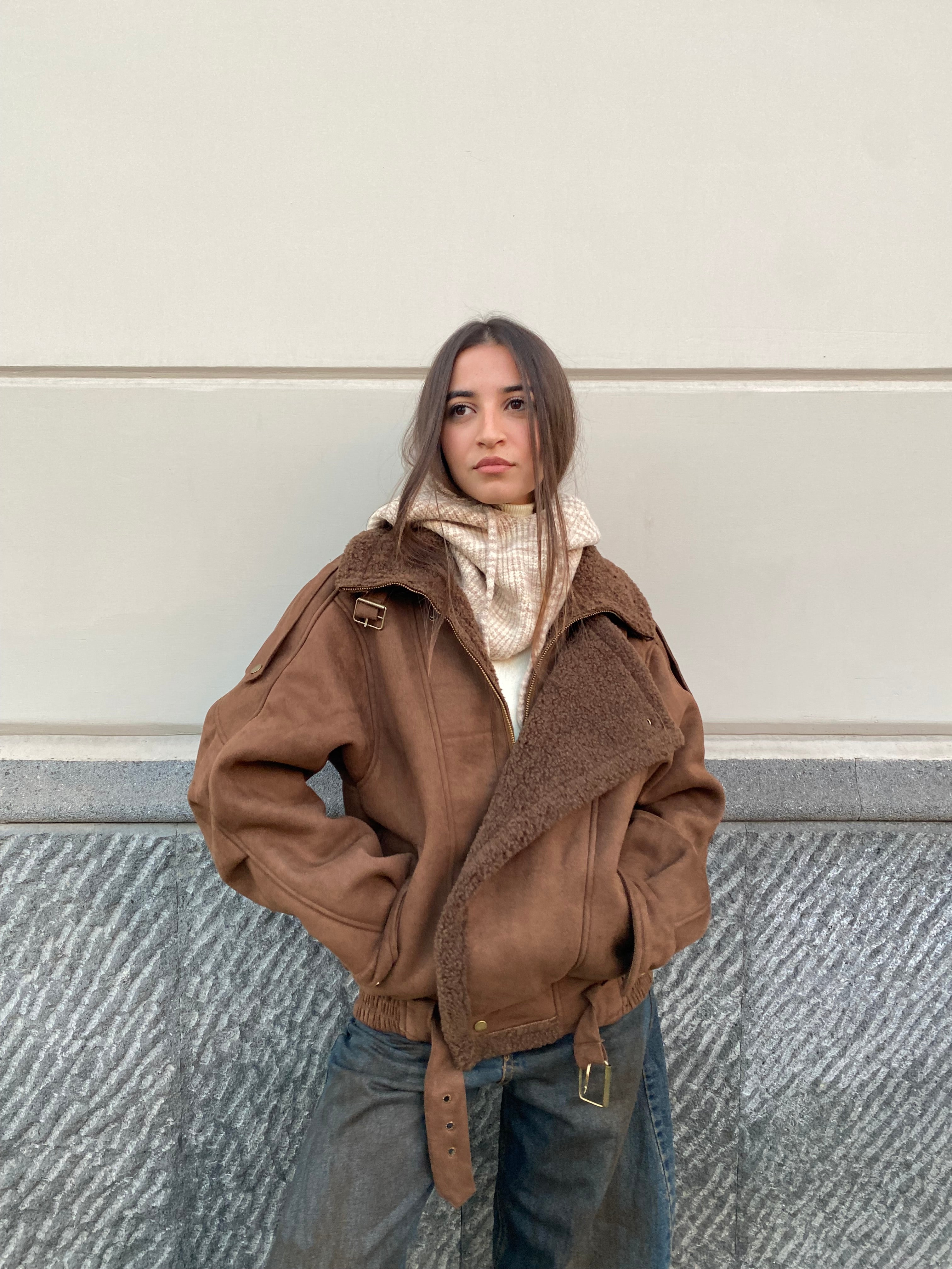 Giubbino modelo montone, in ecopelle esterna ed ecopelliccia interna, chiusura a zip e bottoni, vestibilità oversize, comodo...