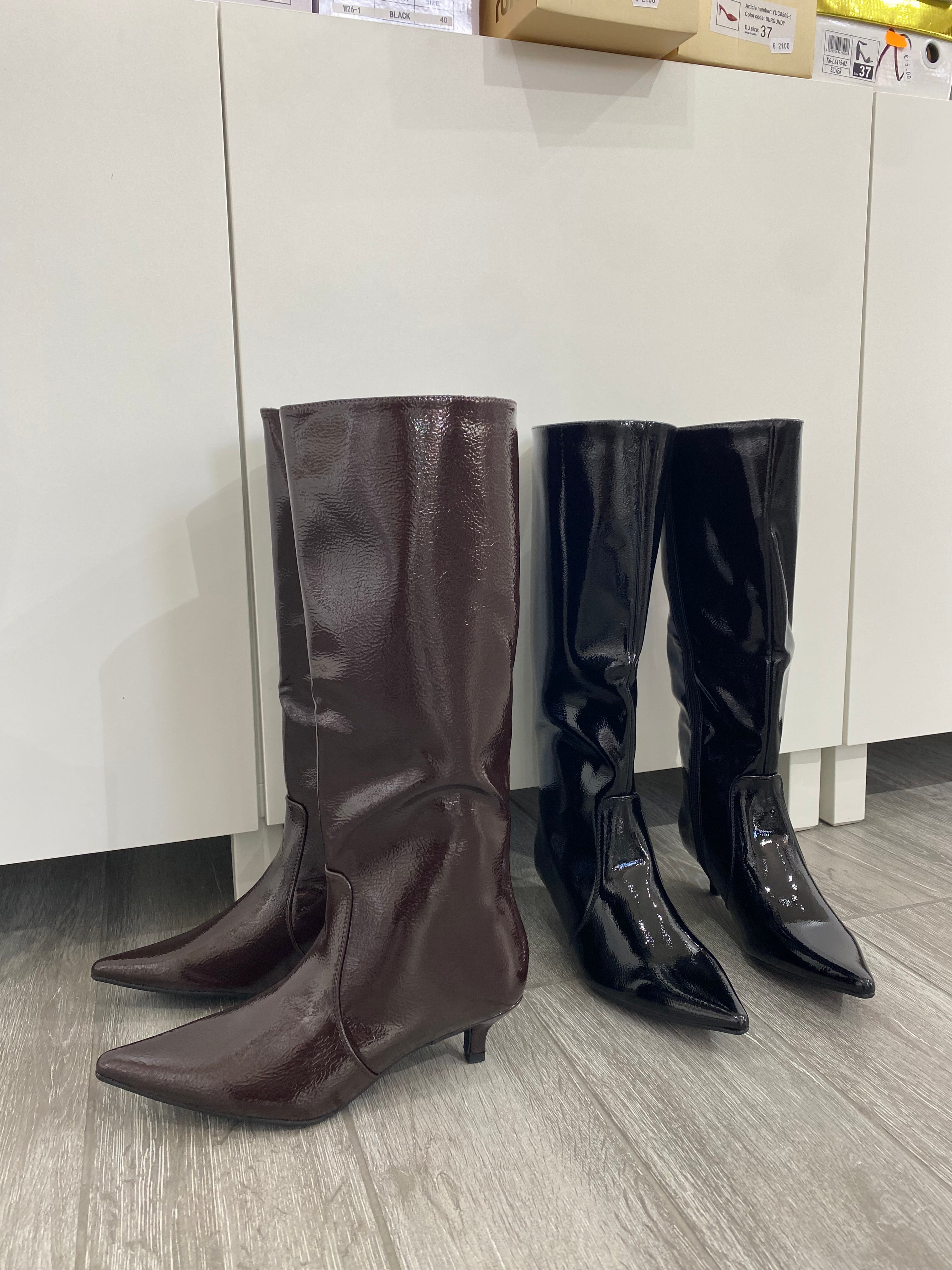 Gambale 44 cm, tacco 4 cm, vernice lucida.