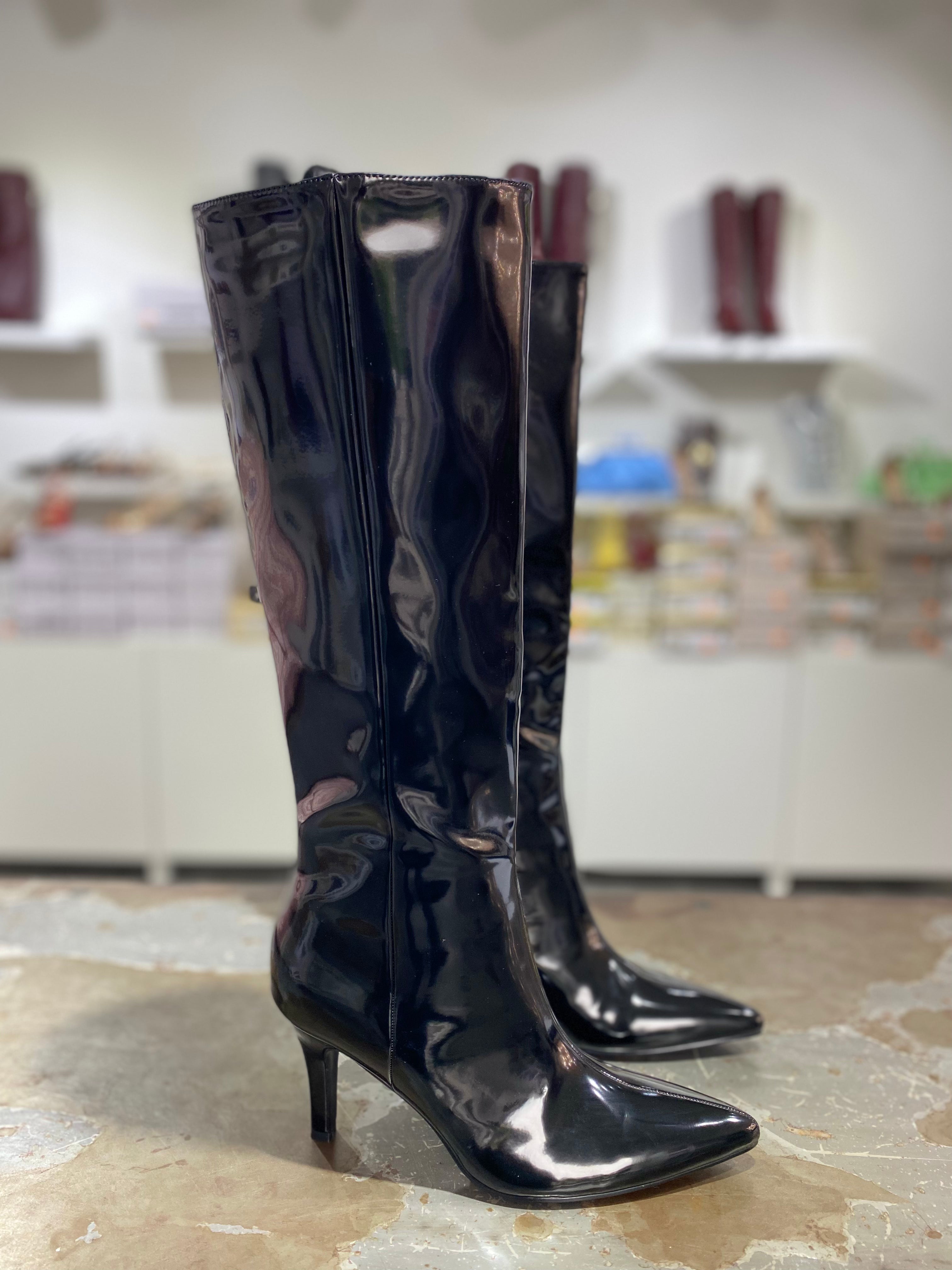 Stivali alti in ecopelle lucido, tacco a spillo da 8 cm e gambale da 48 cm.