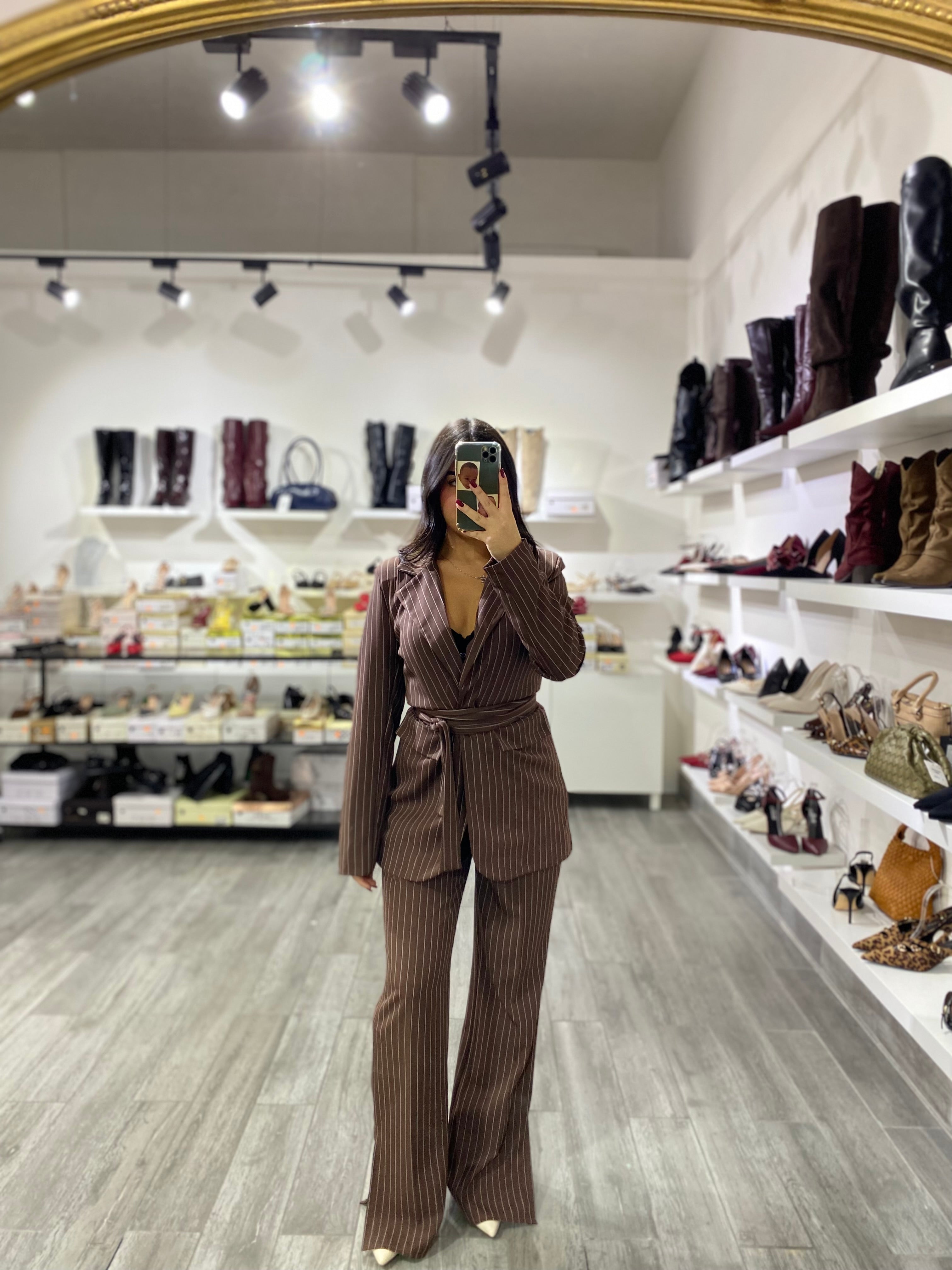 Tailleur con giacca oversize, con cintura per regolarne la larghezza, pantalone palazzo con elastico in vita e...