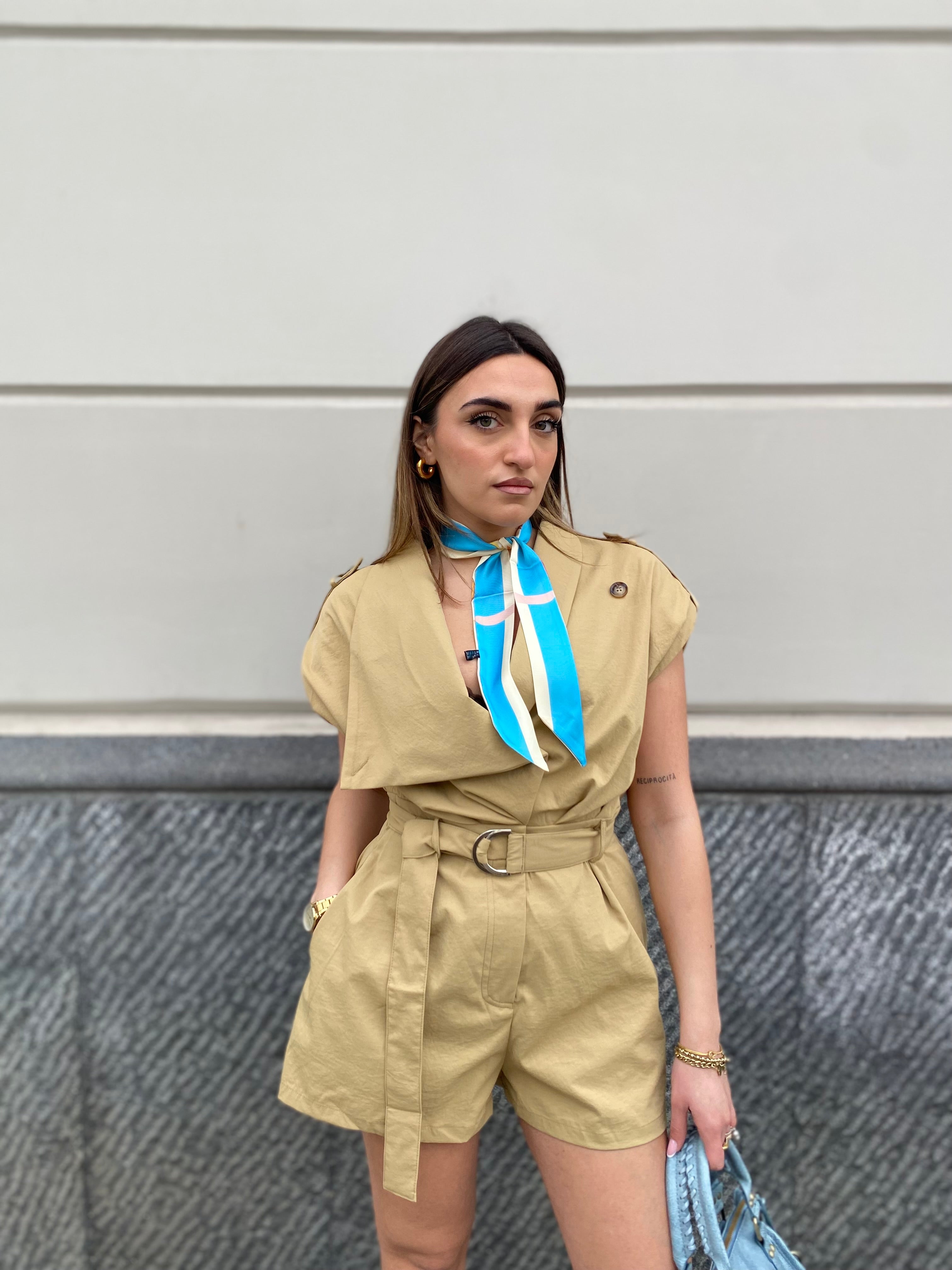 Tutina in cotone con chiusura diagonale, elasticizzata, con cintura inclusa.